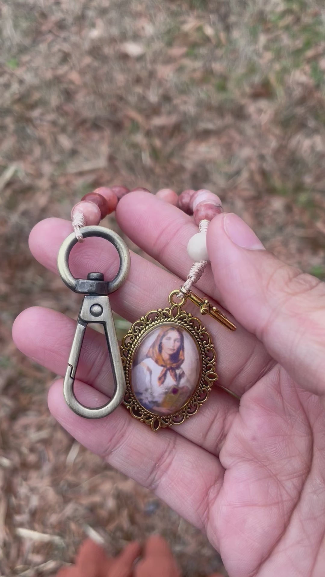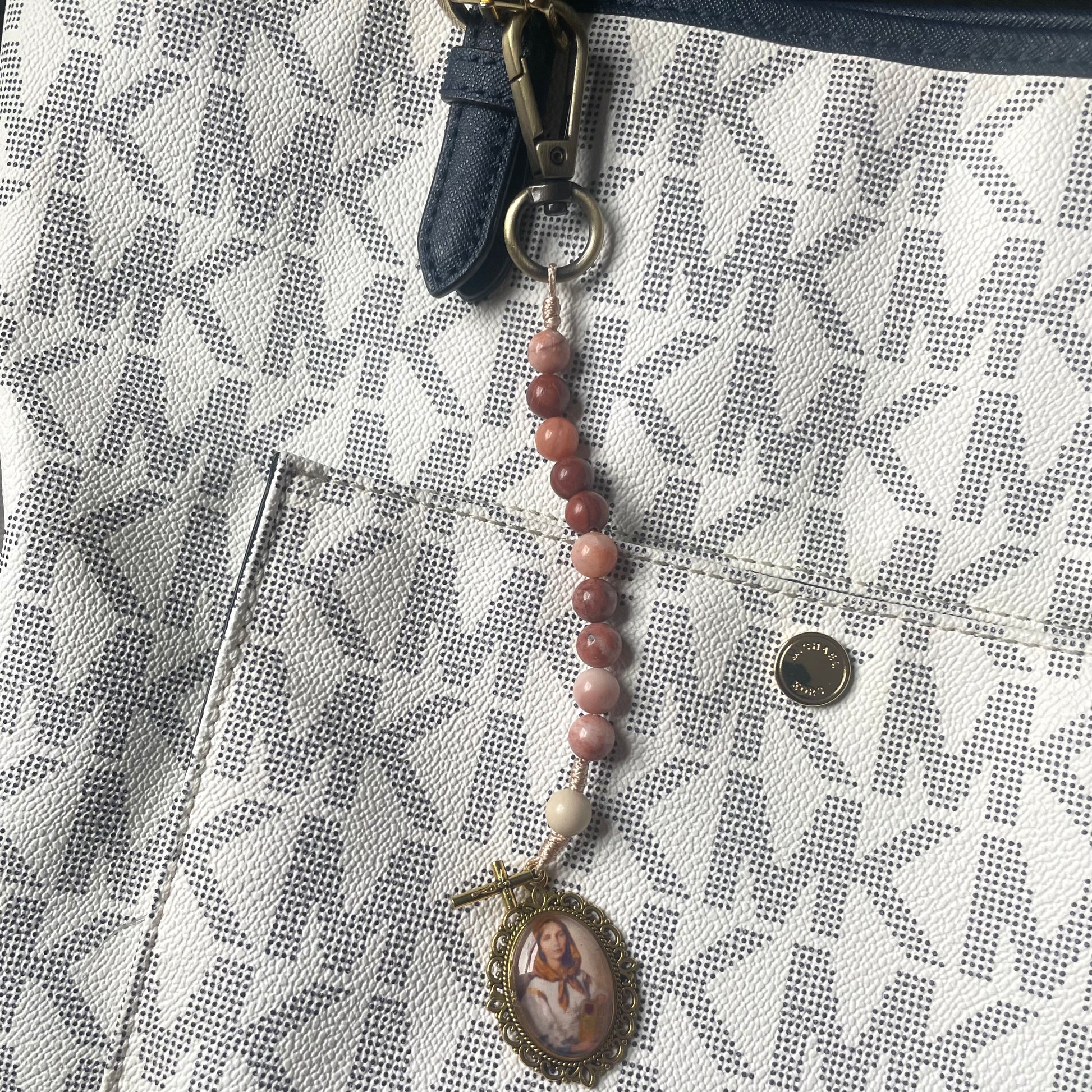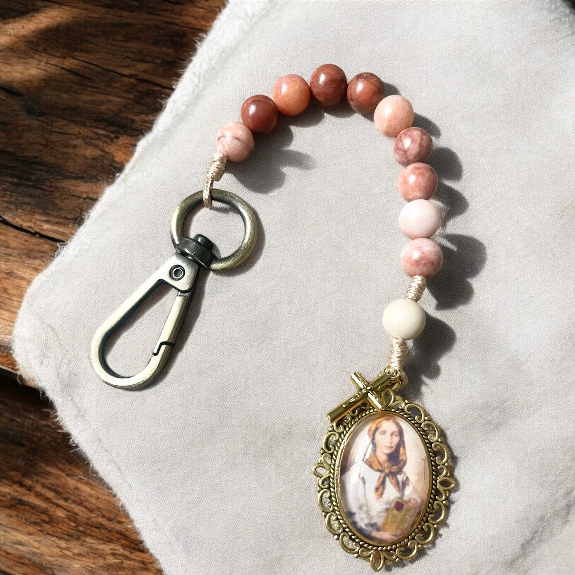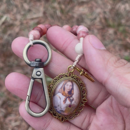 Featured here is a one decade rosary made with 8mm peach stone beads. It is adorned with a Saint Dymphna medal and a mini crucifix. The end of the rosary is knotted to a keychain clasp that you can easily attach to your purse or belt loop.