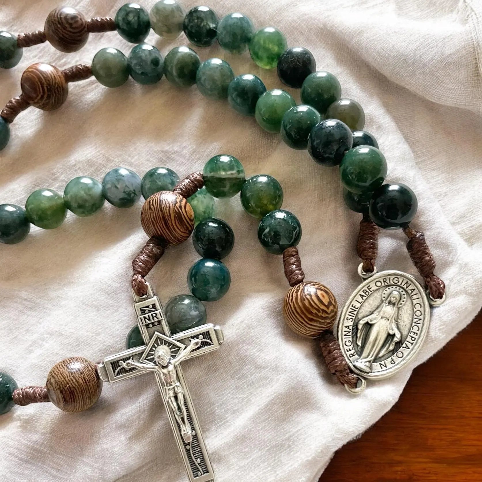 This rosary is handmade with 8mm stone (moss agate) Ave beads, 10mm wood Pater beads, and a brown cord. It is adorned with a Miraculous Medal center and a Vine crucifix.