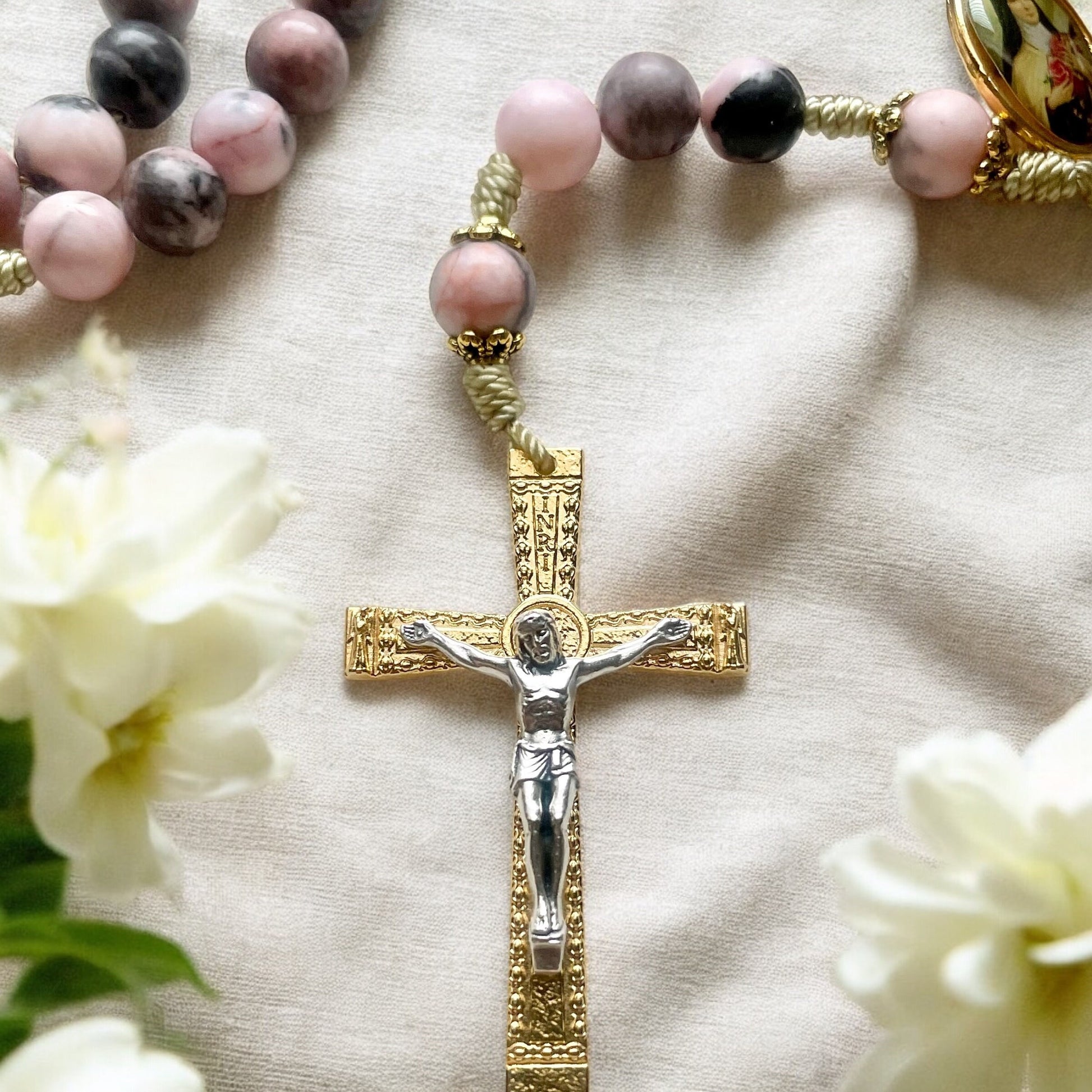 This rosary is handmade with 8mm pink zebra jasper stone beads, and a gold waxed cord. (Due to supply issues, we are substituting the gold cord to a Champagne cord).